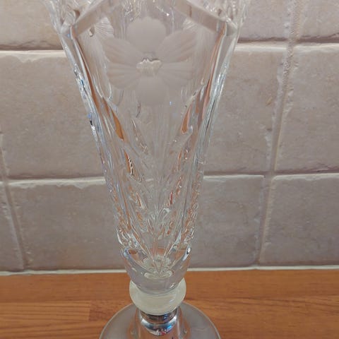 Antiikkinen kristallimaljakko hopeisella jalustalla, 830 H näyte, maljakon kokonaiskorkeus on 26,5 cm, halkaisija 9,5 cm, erinomaisessa kunnossa, virheetön, paino 1 kg 360 grammaa