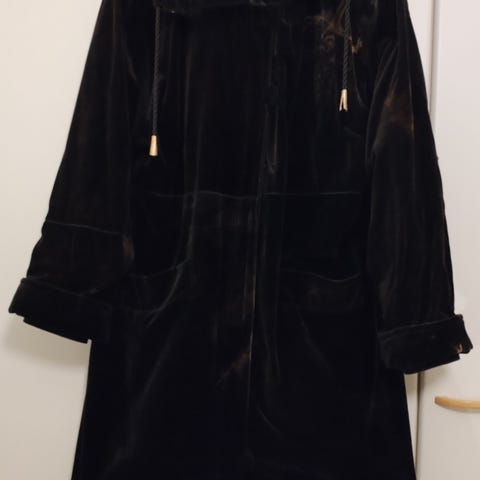 Kuvien mukainen upean yksilöllinen turkulaisen Boutique Heebenin A-linjainen hupullinen frillahelmatakki. Käsinvärjättyä ylellisen pehmeää samettia. Takissa mikrokuitukangasvuoren lisäksi Thinsulate-vuori. Edessä vetoketjukiinnitys ja neljä nappia.
