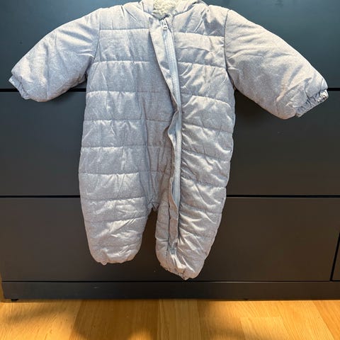 Haalari on tikattu, kevyesti topattu ja sisällä on pehmeä vuori. Siinä on vetoketjukiinnitys sekä huppu ja jalat saa käännettyä jalkojen yli. Sopii hyvin syyskeleihin 🍁
