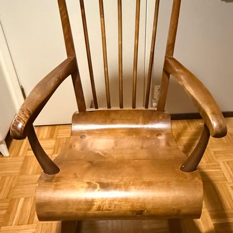 Hyväkuntoinen Nakkilan keinutuoli. Liitokset puutapeilla. Väri vaaleanruskea. Alkuperäinen petsaus ja lakkaus. Tiettävästi Matti tai Kari-Pekka Kankerin tekemä.