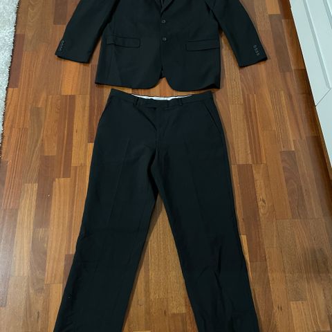 Myydään kuvassa näkyvä miesten musta puku koko:50. Housuissa takana repeämä näkyy kuvassa. Hinta:50€