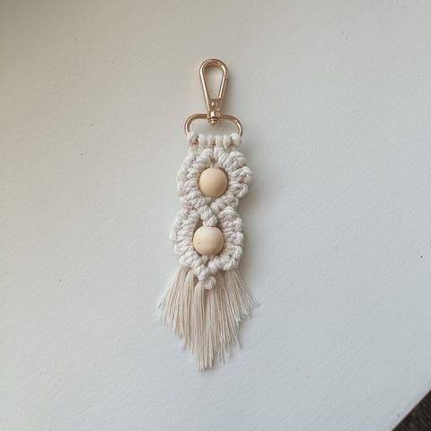 Makramee tyylillä tehty avaimenperä. Käyttämätön.