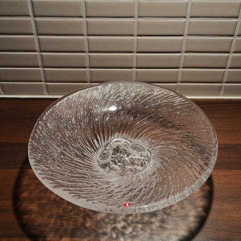 Iittala Flora lasiastia kirkasta lasia. Suunnittelia Oiva Toikka. Astia on koristeltu kukkakuvioilla ja sopii esimerkiksi tarjoiluun tai sisustukseen.