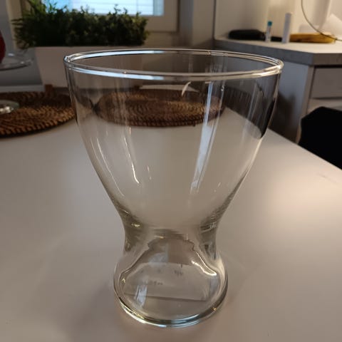 Maljakko on valmistettu lasista ja siinä on vihreä ja valkoinen väriyhdistelmä. Maljakossa on pieni jälki, kuten kuvassa näkyvä pieni kolhu.