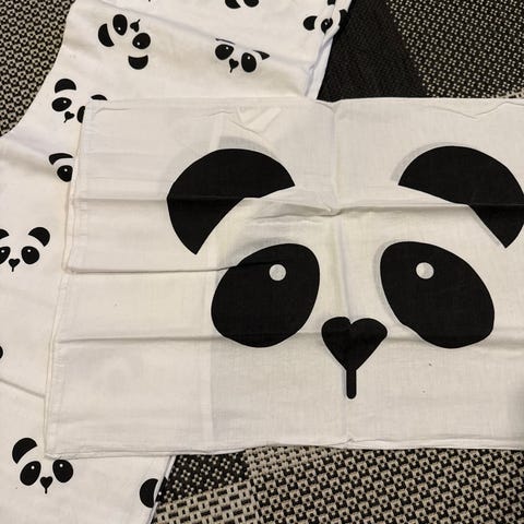Hyvökuntoinen lasten macarons-kuvioinen pussilakanasetti. Valmistajan mukaan pussilakanan koko 120x160 cm ja tyynynliinan koko 40x60 cm. Pesun jäljiltä koot vastaavasti 110x150 cm ja 37x59 cm. 100% puuvillaa.