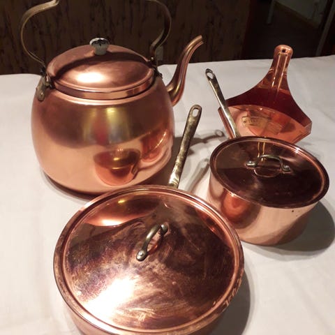 Kauniit kupariastiat: kuparikahvipannu ja kuparikasari. Kasarin tilavuus on 1,5 l ja pannun hieman pienempi.