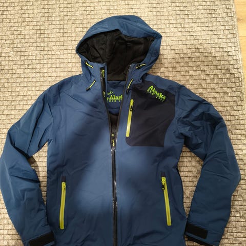 Alaska Talvitakki beigen ja vaalean sekä tumman sinisen väreissä,miesten koko 52. Takki on ulkotakki, tarkoitettu kylmempään säähän. Ohut huppu on irrotettava, taskuissa vetoketjut