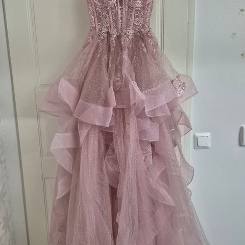 Upea vaaleanpunainen kimaltava vanhojentanssimekko. Koko xs, mutta menee myös s kokoiselle. Mekon takaa hieman kavennettu, mutta pystyy purkamaan siististi. Pieni vekki tyllikankaassa, ei näy päälle on alaosissa.