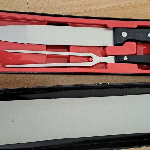 Myydään paistiveitsi ja haarukka, veitsi 32cm ja haarukka 28, ruostumatonta terästä, varret puuta ja kotelo muovia. Nouto Varkaus Kangaslampi tai postit lisätään.