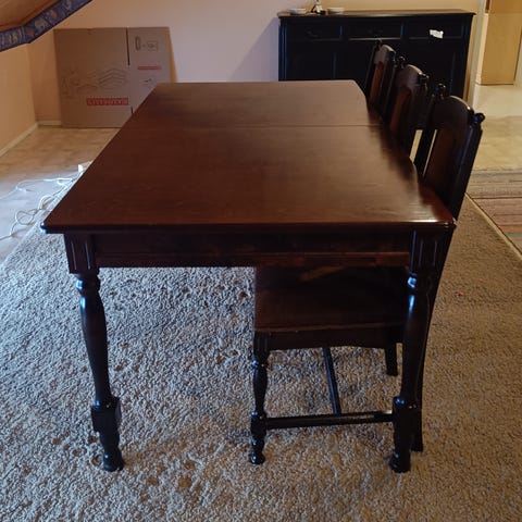 Myydään kaunis vanha ruokailuryhmä. Koivusta tehty. Pöytä pyöreä tai lisäosalla ovaaliksi. Kuusi tuolia. Tuolin pehmusteet vaihdettu noin viisi vuotta sitten.