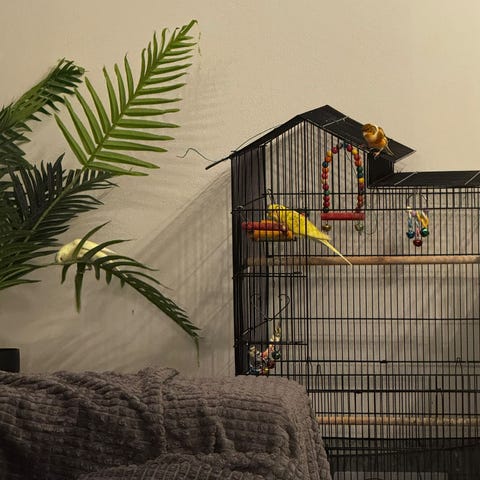 Kanarianlinnut häkkineen ja ruokatarvikkeineen Mydään