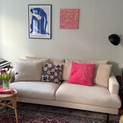 Nest&Living malliston tyylikäs ja kivan mallinen vaalealla kankaalla verhoiltu sohva.