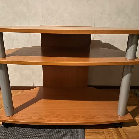Pyörillä liikkuva tv-taso, jossa lasinen levy päällä, joka kääntyy.