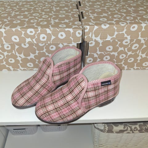 Reino & Aino merkkiset Aino tohvelit. Koko 35, mutta vastaa mielestäni enemmän kokoa 36. Hyväkuntoiset, olleet 10-vuotiaalla lapsella satunnaisessa käytössä aamutossuina sisällä.