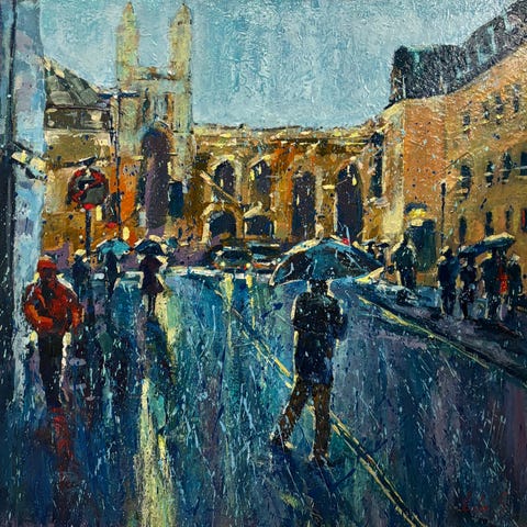 Akryylimaalaus 40x50 cm “Punainen mökki ja perunamaa” Teoksessa on värikäs ja monimuotoinen kuvasto, joka sisältää ihmishahmon, kasveja ja veneen veden äärellä. Taulu soveltuu sisustukseen ja taidekokoelmiin.