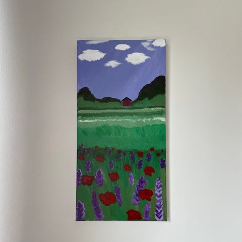 Akryylimaalaus 40x50 cm “Punainen mökki ja perunamaa”