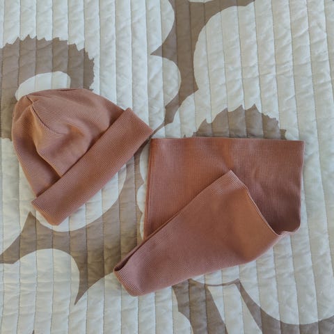 Raidallinen trikoopipo, yksinkertainen neulos. Pesty ilman hajusteita.