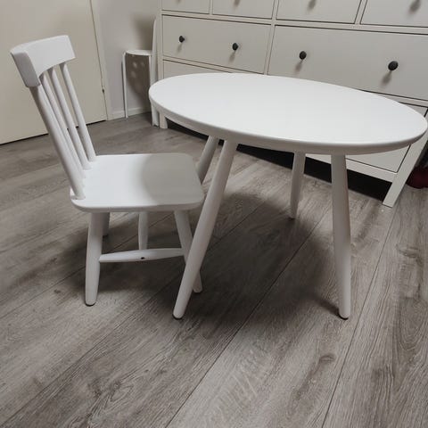 Jykevä ja siisti puinen pöytä ja neljä tuolia. Vähäistä käytönjälkeä. Pöydän mitat: 85x55cm kork. 50cm.