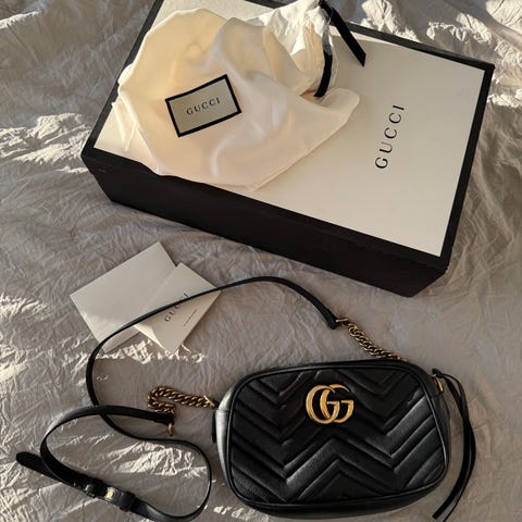 Gucci GG Marmont Camera Bag Small on kaunis ja ajaton laukku, joka on valmistettu pehmeästä valkoisesta nahasta tuoden sille raikkaan ja elegantin ilmeen. Edessä oleva ikoninen kultainen GG-logo viimeistelee kokonaisuuden tyylikkäästi. Laukku on käytännöllisen kokoinen, sinne mahtuu helposti puhelin, lompakko, avaimet sekä pieni meikkipussi. Täydellinen valinta niin arkeen kuin juhlaan! Laukku on valmistettu Italiassa.