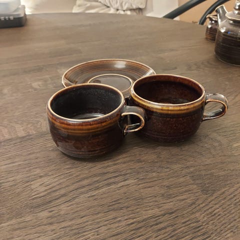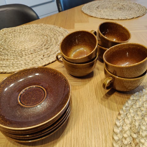 syysiltojen iloksi upea Mahonki teekuppi astiasto 12 kpl kuppia lautasineen ,4 kpl voileipälautanen,kermakko ja sokerikko