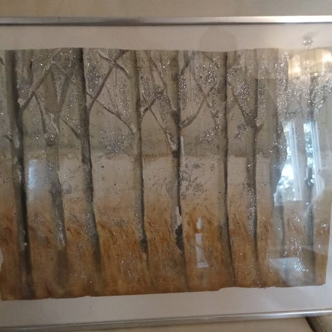 Kaunis iso taulu, rustiikkiset kehykset (kuva). Voi toki maalata, itse en ole halunnut maalata. Nyt pienempään asuntoon muuttaessa ei enää tilaa. Koko 90*70.