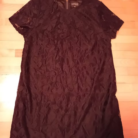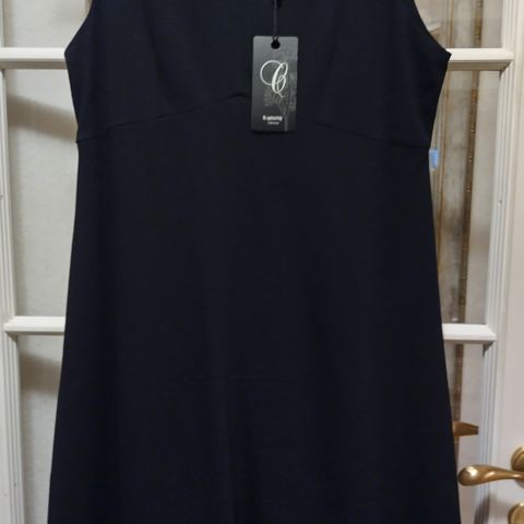 Uusi, käyttämätön kaksinkertaisesta kankaasta, mekko. Päällinen musta, alempi osa hennon salvian värinen, yhdessä läpinäkymätön.