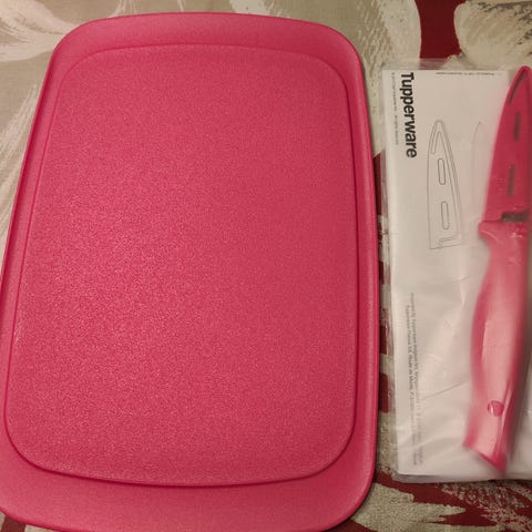 Tupperware. Pieni leikkuulauta mitat pituus 26 cm leveys 18 cm ja Yleisveitsi missä teräsuoja hinta yht 30 € käyttämättömät kulkeutuu sovittaessa lähialueelle + postitus