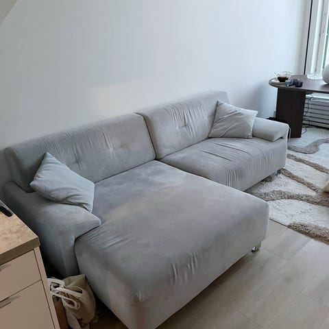 Istuinsyvyys 55cm, istuinkorkeus 43cm Verhoilu: Pronto kangas: 100% polyesteri chenillea, martindale 36 000 (norm. 990,-)