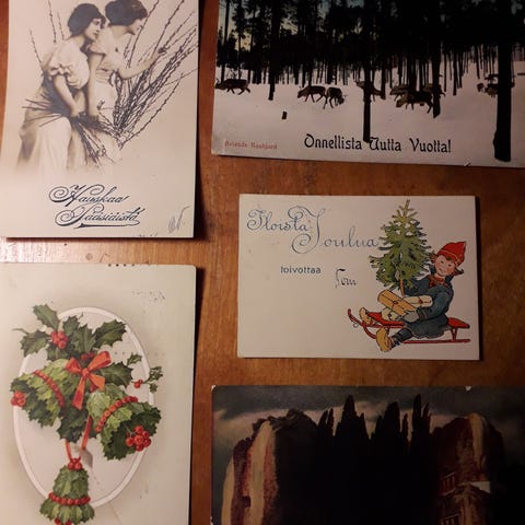 Joulu- ja Uuden vuoden kortit sekä Lahti - Kansanopisto (kortti H. Syvänteen Kirjakauppa) ja Helsinki Pörssi ja Fabianinkatu.
