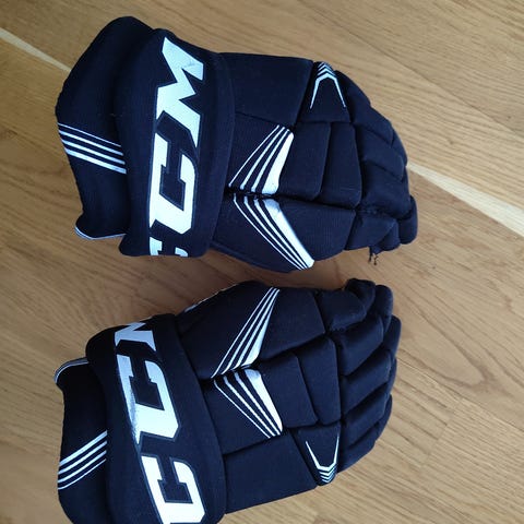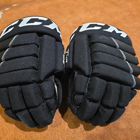 CCM pelihanskat, mustat, koko 10”. Muuten hyvässä kunnossa, paitsi toisessa peukalossa pieni reikä.