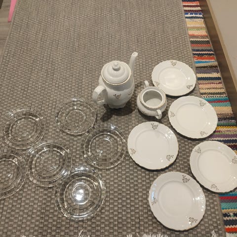 Teepannu ja kuusi mukia. Porsliinia