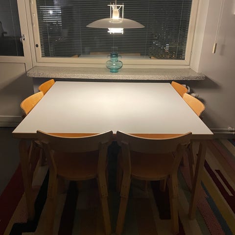 Artek Alvar Aalto ruokapöytä, valkoinen laminaatti + lakattu koivu. Artek tuoli 66 koivu/saarni, näitä 6kpl.