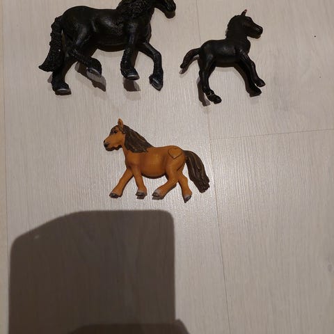 Leikeissä olleet, mutta hyväkuntoiset Schleich hevoset ja poni.
