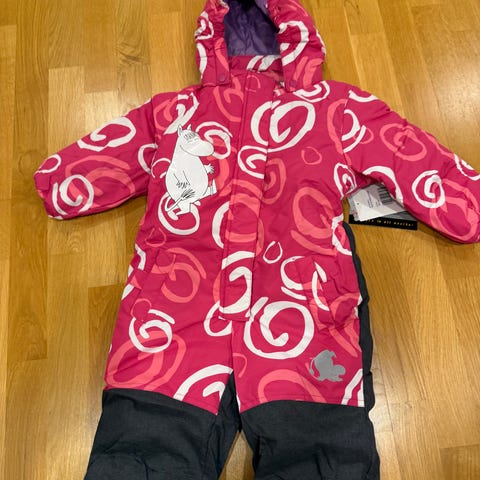 Muumifanin röyhelöinen talvihaalari. Jäänyt vähäiselle käytölle, kunto mainio. Jalkalenkit puuttuvat, kaikki napit ovat paikoillaan.