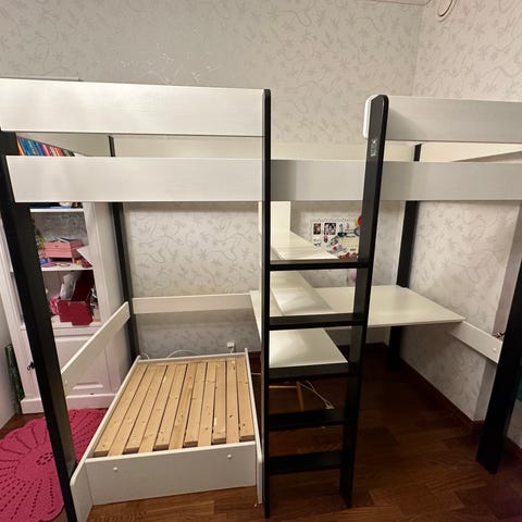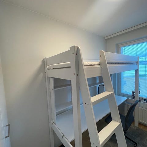 Joa parvisänky pöydällä ja hyllyillä sopii niin nukkumiseen, pelaamiseen kuin opiskeluunkin.