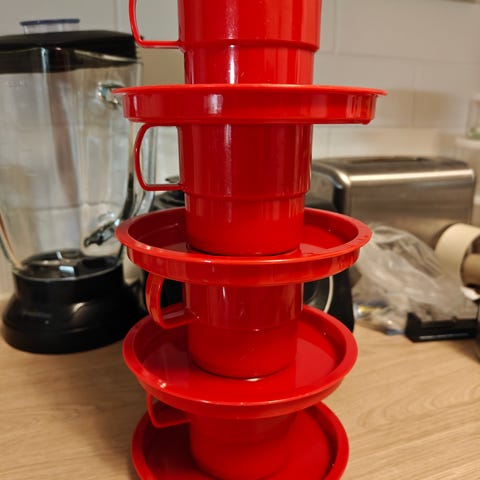 Kaksi retroa Sarviksen kahvikuppia tasseineen