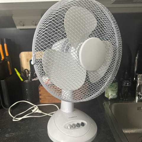 Tehokas tuuletin, ei liiku sivuttain mutta pystysuunnassa kyllä ja voi kallistaa puhallussuuntaa. Tehoja löytyy (säädettävä).