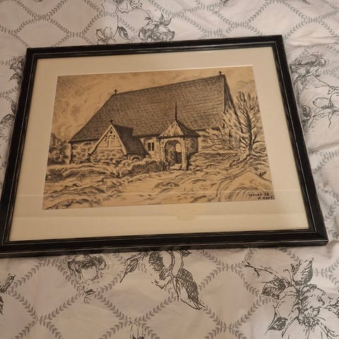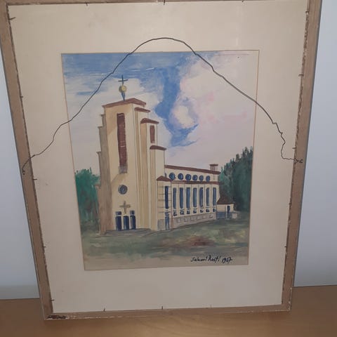 Lehtisen taulu naisesta, joka toimi kirkkomaalarinakin tunnetun taidemaalarin mallina joissain hänen kirkollisissa maalauksissa. Taulun toisella puolella Sakari Rostin työ Taulumäen kirkosta 1947. Taulun koko 56x46 cm. Lasitus.