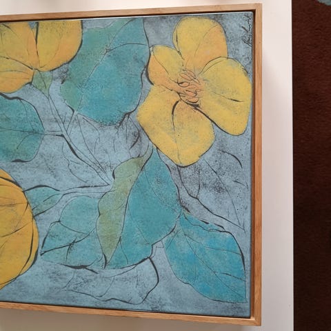Myyn 3 kpl puualustaan upotettuja keramiikkatauluja, design Kristiina Saanio. Taulut nimeltä VÄINÖNPUTKI, LAPINVUOKKO, KARHUNSAMMAL. Taulun koko 15 x 12 cm.