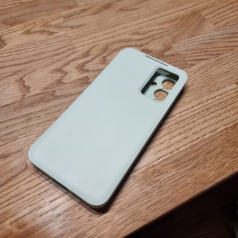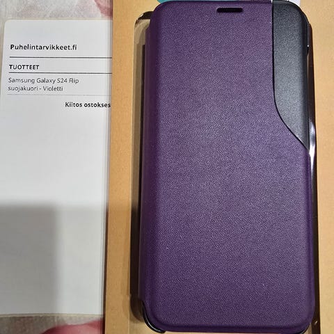 Puhelimen suojakotelo avaamattomassa paketissaan. Sisällä tilaa maksuvälineille: korteille 3 paikkaa ja leveä tasku seteleille.