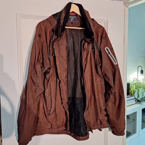 Vettä hylkivä kevyt ulkoilutakki. Muuten todella hyvä mutta hupun oikealla puolen pieni reikä (näykkään kuvassa).