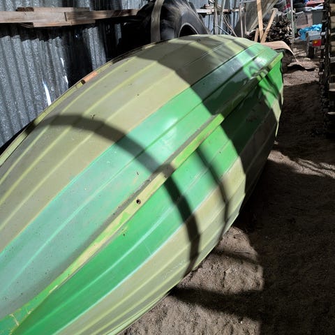 Lohi lasikuituvene, airot ja kumitappi sekä lisäksi venetelakka, johon voin tarvittaessa lisätä ladylike liinavinssin, niin on helppo vetää vene telakalle. Vene on kunnostettu. Viimeksi pesty, hiottu ja paikkamaalattu spray automaaleilla, valkea ja oranssi. Tarvittaessa voin tuoda veneen peräkärryllä, kun sattuu nyt siinä olemaan Siilinjärven ja Kuopion alueelle.