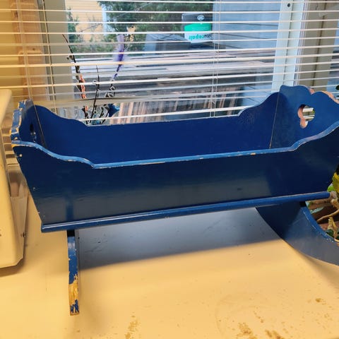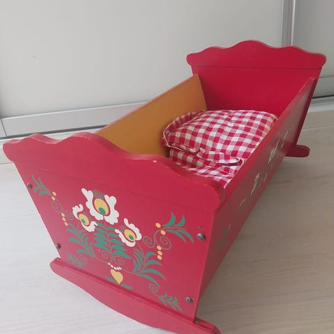 Vuosikymmeniä vanha puinen kehto ( 1950-luvulla...?) , joka ollut nuken kehtona ja nyt myöhemmin sisustuselementtinä. Käsin tehty.