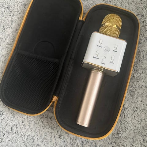 Karaokemikrofoni, mukaan tulee latausjohto ja kotelo.