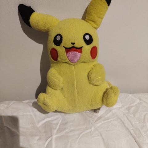 Myydään Pikachu pehmolelu. Korkeus noin 43 cm, korvineen noin 52 cm. Häntä lähtenyt joskus irti ja ommeltu kiinni, kuvissa näkyy. Koirakoti.