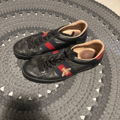 Gucci GG nahkakengät erinomaisessa kunnossa, ei moitteita mikä haittaisi käytössä. Juuri lankatut ja käsitelty nahka. Koko kengässä 42, mutta istuu isommin. Enemmin 43,5. Mukaan GG guccin oma kenkä pussi.