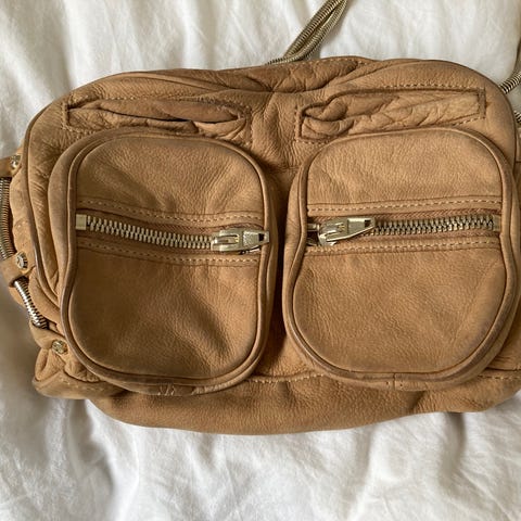 AW Branda Zip Bag malli hyvässä kunnossa, yleisilme erittäin siisti. Kaksi taskua ja kaksi vetoketju taskua edessä. Sisällä vetoketjutasku. Olkahihna metallisia remmejä/rihmoja joissa nahkatuki pala ylhäällä. Näyttävä ja laadukas merkkilaukku, voin laittaa fit kuvan päällä👍🏻