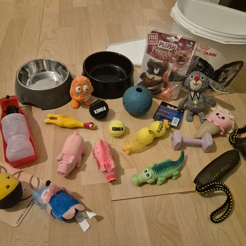 Pienelle/keskikokoiselle koiralle lelusetti. Sopinee hyvin myös keskikoisen koiranpennun leikitykseen. Käytettyjä, mutta jääneet tarpeettomiksi nykyisten koirien tarpeisiin.