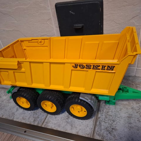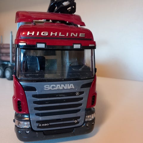 Scania mallinen kuorma-auto ja perävaunu, sininen kuorma-auton ohjaamo ja harmaa kuormatila. Kuorma-autossa on kippiominaisuus, joka mahdollistaa kuorman helpon purkamisen. Malli on valmistettu muovista ja metallista, soveltuu kokoelmiin tai leikkeihin. Perkärryn perälauta viallinen