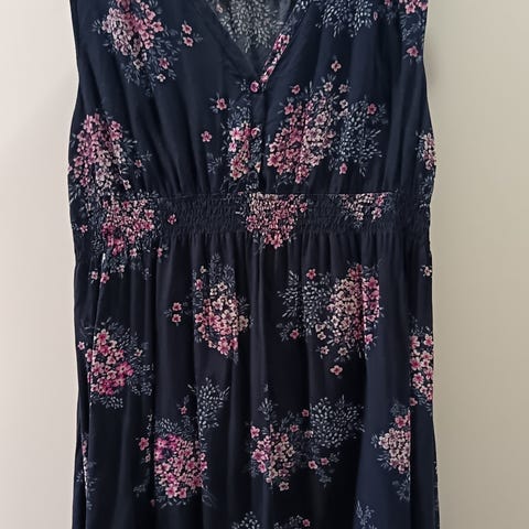 Ihana, kevyt tummansininen äitiys- tai imetysmekko. Tyyliltään juhlava, mutta sopii hyvin myös vaikkapa toimistolle! Pituus edestä helmasta olkapäähän n. 91 cm ja takaa kauluksesta helmaan n. 88 cm. Leveys kainalosta kainaloon n. 50 cm, leveys olkapäästä olkapäähä n. 37 cm. Vyötärön leveys saumasta saumaan n. 50 cm.